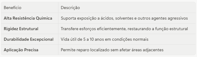 Quando o objetivo é restaurar a integridade estrutural, a resina epóxi oferece vantagens incomparáveis. Sua rigidez e resistência mecânica fazem dela a escolha ideal para elementos que precisam voltar a suportar cargas e esforços.
